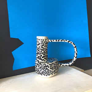Dimensions : ø 12 cm. Hauteur 21 cm. Largeur avec anse 22 cm. Matériaux : Grès blanc, émail brillant.